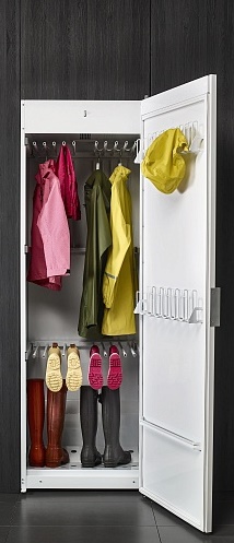 Прибор является отдельно стоящим и подключается к вентиляции для эффективной работы вытяжной системы. Перенавешиваемая дверь обеспечивает удобство эксплуатации вне зависимости от расположения. Нагревательный элемент и вентилятор находятся в верхней части, что обеспечивает максимально эффективное движение теплого воздуха. Наличие термовыключателя помогает регулировать температуру внутри, а плотно закрывающаяся при помощи уплотнительной ленты дверь снижает уровень шума.